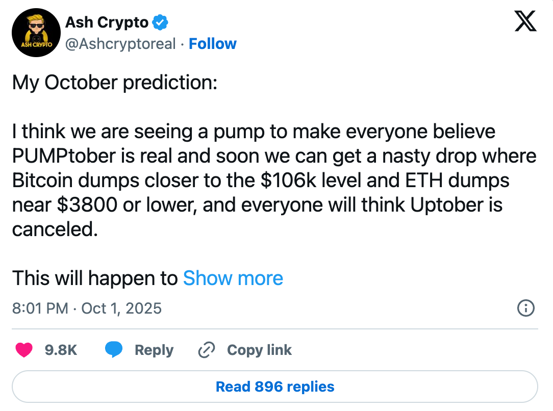 At the start of October, research analyst Ash Crypto predicted that Bitcoin would correct toward $106K and Ethereum to around $3,800 before resuming their upward trend. Both targets were met during the sell-off, validating the first half of his forecast.