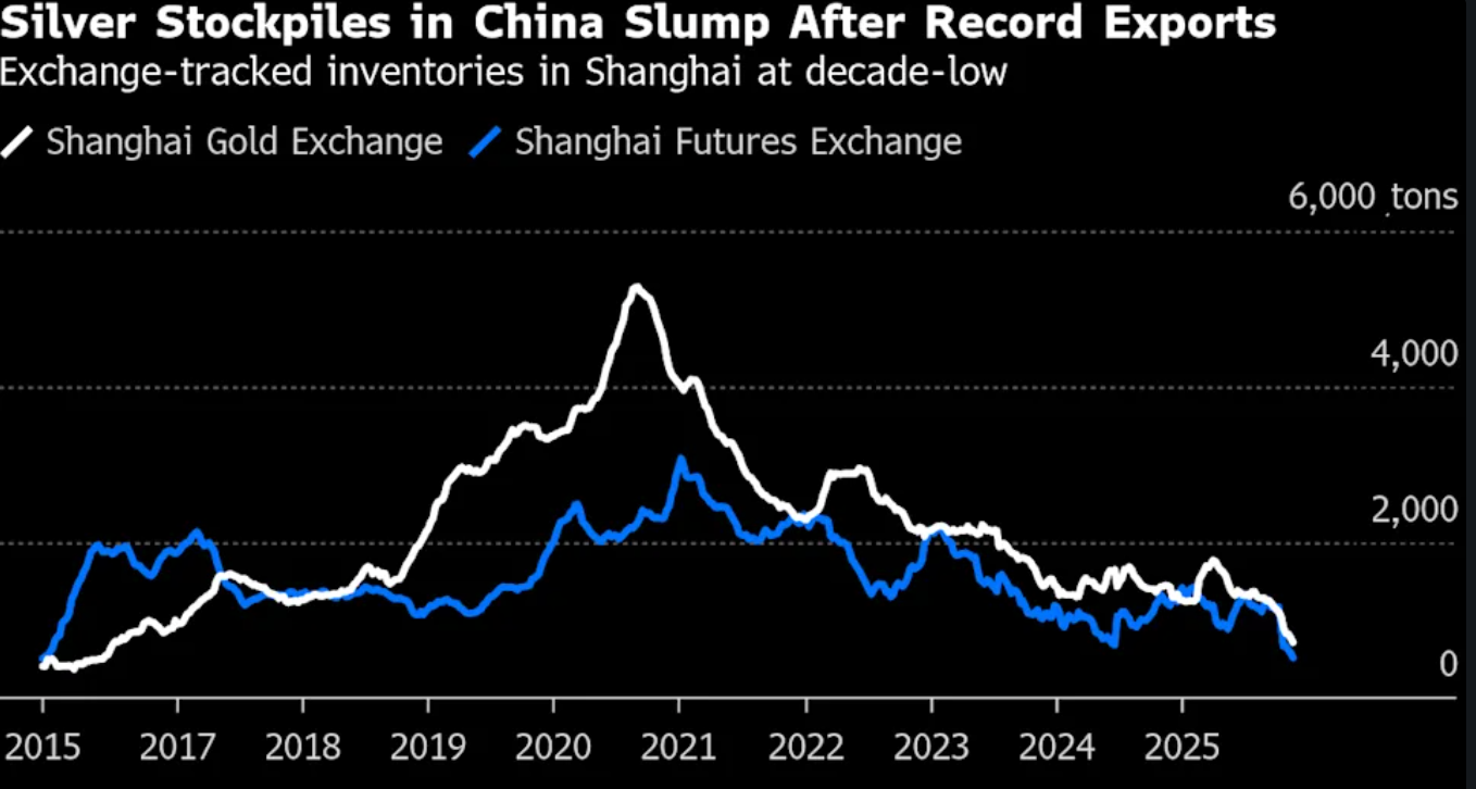 Silver’s surge is tied to industrial demand that has grown faster than supply for several years. London vault inventories have declined from approximately 31,000 metric tonnes in mid-2022 to around 22,000 tonnes by early 2025. In October, overnight lease rates spiked to the equivalent of 200% per year as traders scrambled to secure metal - a clear sign of market stress. London’s situation is similar to China’s, as the country also saw its holdings dwindle, as exports reached a record of above 660 tonnes.