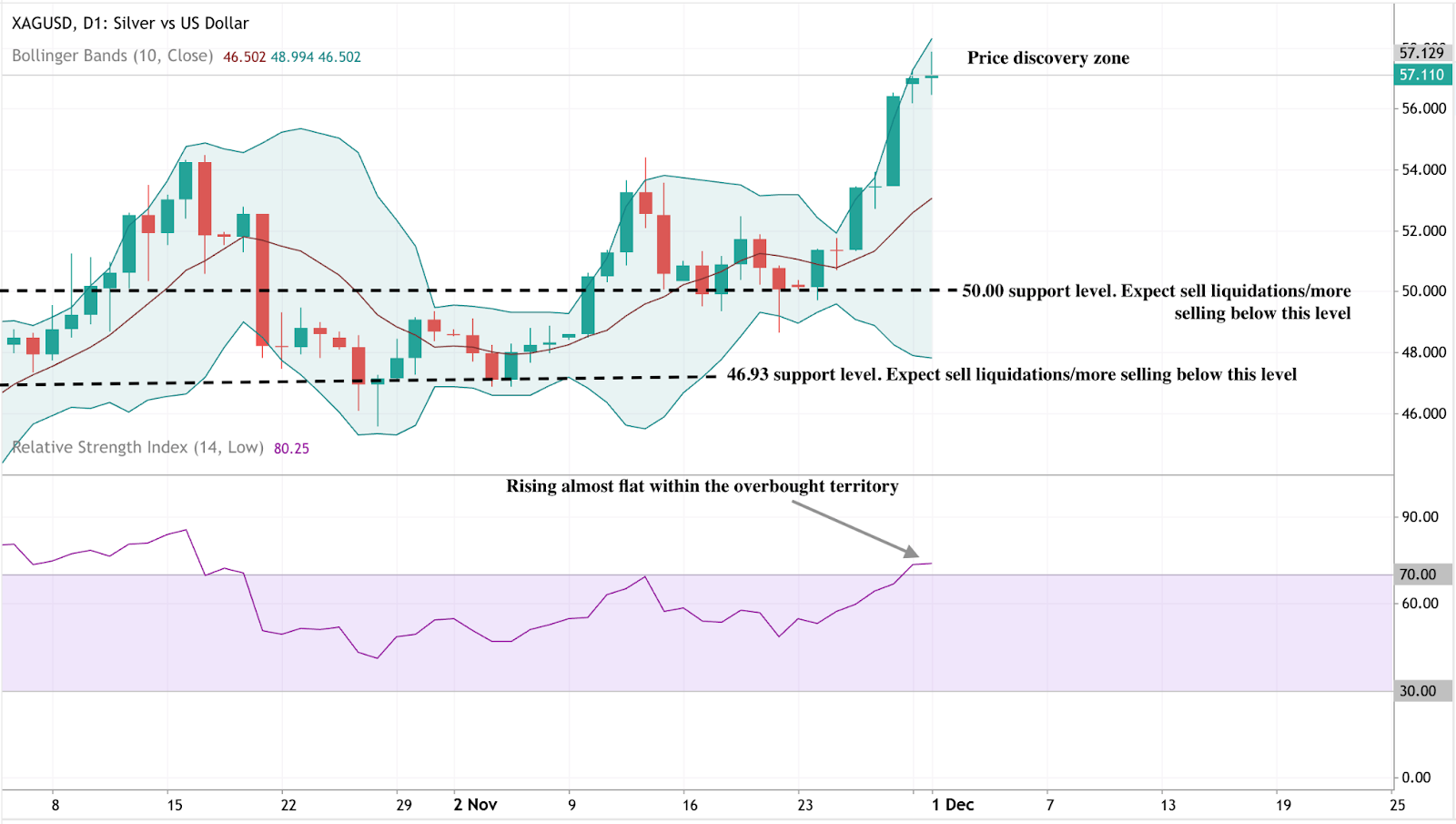 At the start of writing, Silver (XAG/USD) has surged into a price discovery zone, trading above $57 after a sharp breakout from consolidation. The move signals strong bullish conviction, with momentum carrying price well beyond the prior range. Immediate support levels now sit at $50.00 and $46.93, levels where a pullback could trigger sell liquidations and deeper corrective pressure if breached.