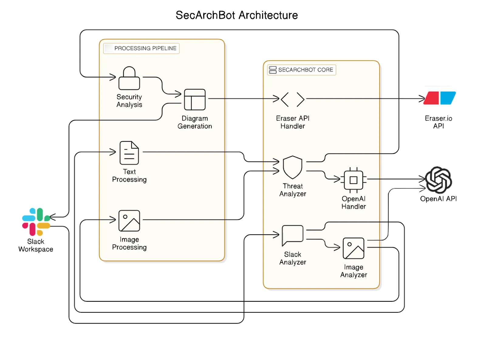 SecArchBot is a Slack bot that analyses system architecture diagrams and text descriptions through a zero trust security lens. It combines optical character recognition (OCR), advanced AI models (OpenAI GPT-4 and Google Gemini), and diagram generation capabilities to provide comprehensive security analysis and recommendations directly within Slack conversations.